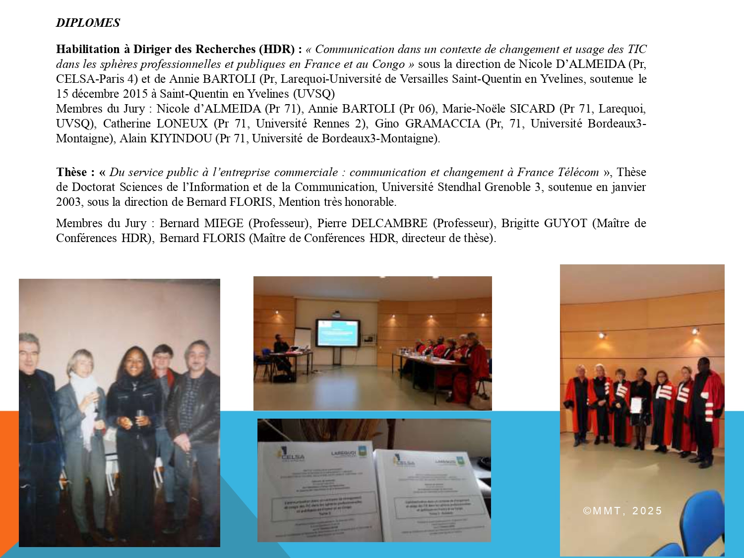 1998 – 2002 : Doctorat ès Sciences de l’Information et de la Communication à l’Université Stendhal (Grenoble III), mention très honorable. Thèse : « Du service public à l’entreprise commerciale : communication et changement à France Télécom », sous la direction de Bernard FLORIS, soutenue le 6 janvier 2003.